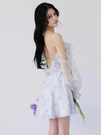 3. 予約商品【1月中旬入荷予定】【Angel R/エンジェルアール】ホルターネック フリル 肩あき 長袖 バックオープン シフォン フラワープリント フレアミニドレス (AR26801)
