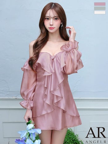 キャバドレス Angel R エンジェルアール オフショルダー ネックストラップ フラワーモチーフ フリル 長袖 フェミニン フレアミニドレス