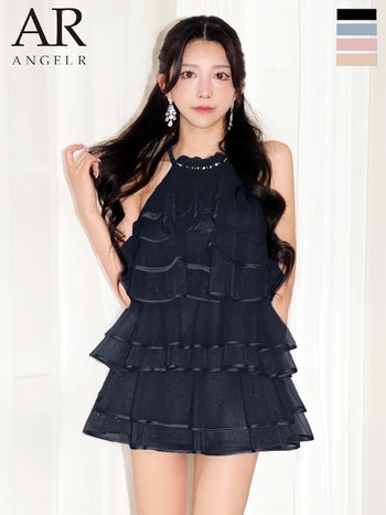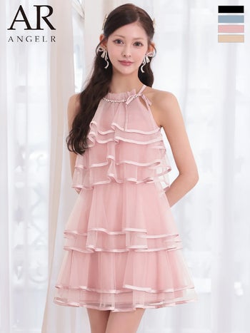 キャバドレス Angel R エンジェルアール ホルターネック リボン ビジュー シアー チュール ティアードフリル フレアミニドレス