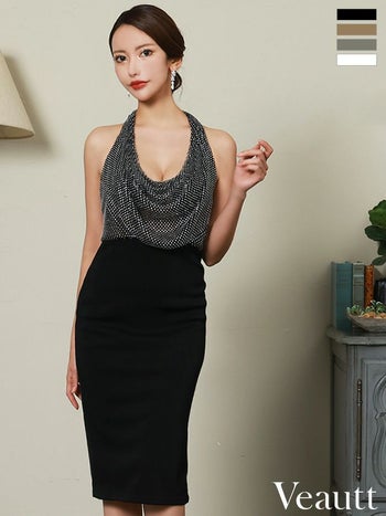 キャバドレス ブランドドレス Veautt ヴュート ドレープ ビジュー 切り替え サイドジップ シアー ひざ丈ドレス