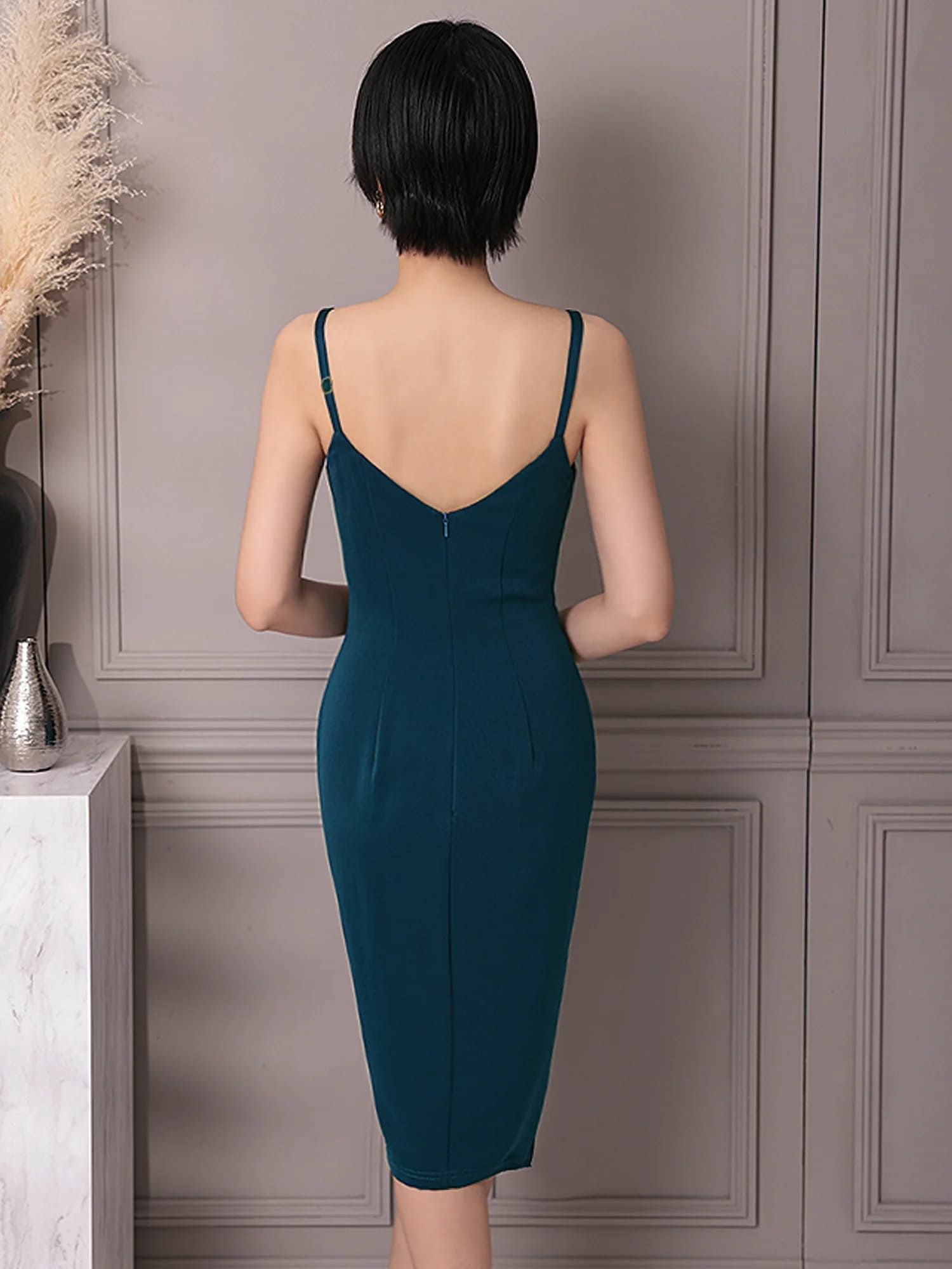 4. 【Veautt/ヴュート】オープンバスト キャミソール チェーン フリル スリット タックデザイン セクシー 膝丈ドレス (VT022521)