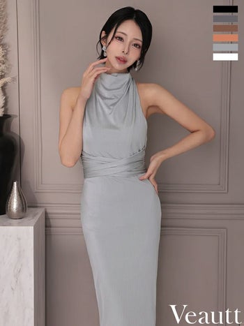 4. 【Veautt/ヴュート】ウエストマーク バックオープン エレガント リボン ホルターネック 膝丈ドレス (VT022522)