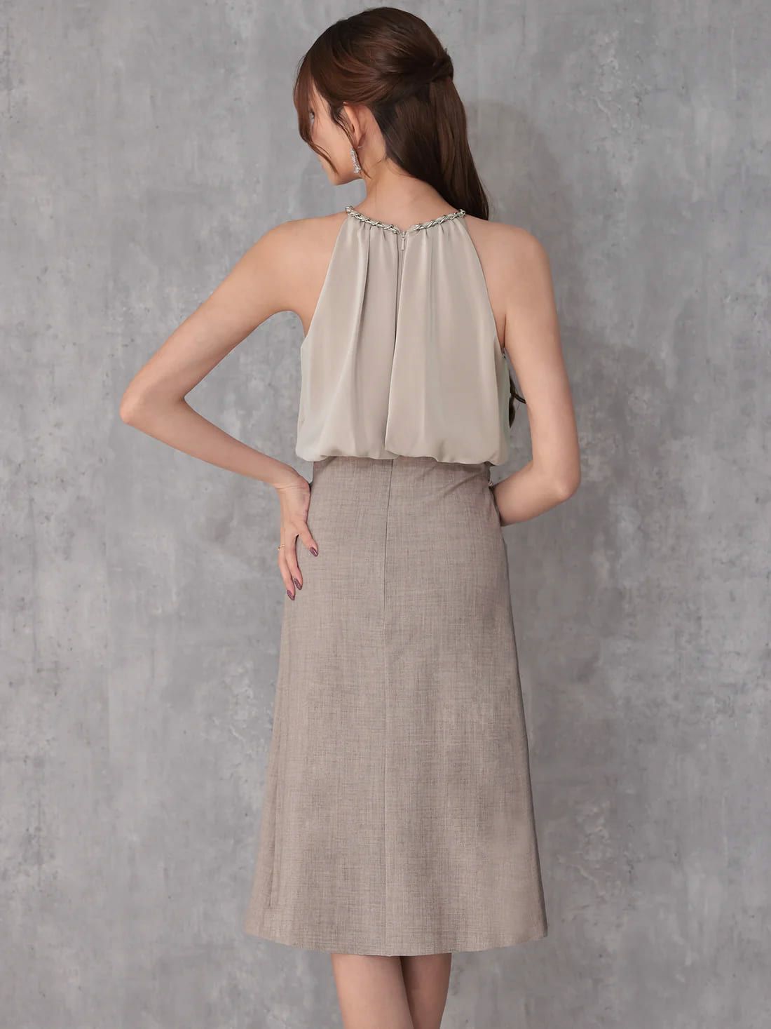 4. 【Veautt/ヴュート】ホルターネック サテン バイカラー チェーン フレア 膝丈ドレス (VT022529)