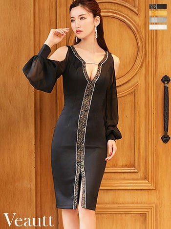 XSあり!ファスナーからご自慢の美脚もアピールできる♪ 【Veautt/ヴュート】シンプル オープンショルダー 袖あり バルーンスリーブビジュー膝丈ドレス(VT03238)