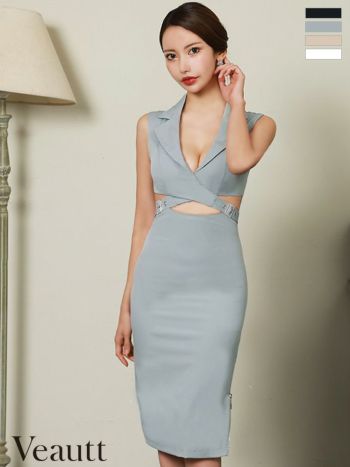 3. SALE【Veautt/ヴュート】クール バックル ジップデザイン オープンカラーバストクロス ノースリーブ ミディアムタイト ひざ丈ドレス(VT032402)