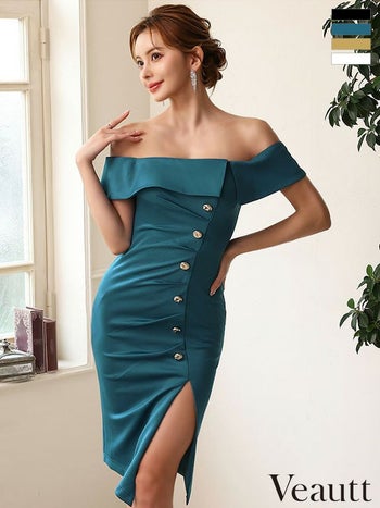XSあり!視線を惹き付ける一着♪ 【Veautt/ヴュート】タックデザイン セクシー スリット オフショルダー フロントボタン 膝丈ドレス (VT032406)