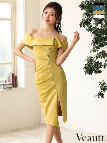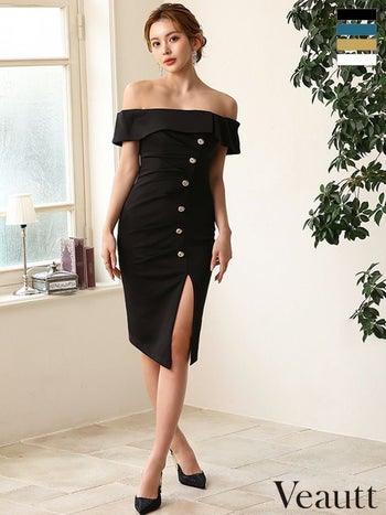 XSあり!スッキリとしたボディーライン♪ 【Veautt/ヴュート】セクシー スリット オフショルダー フロントボタン タックデザイン 膝丈ドレス (VT032406)