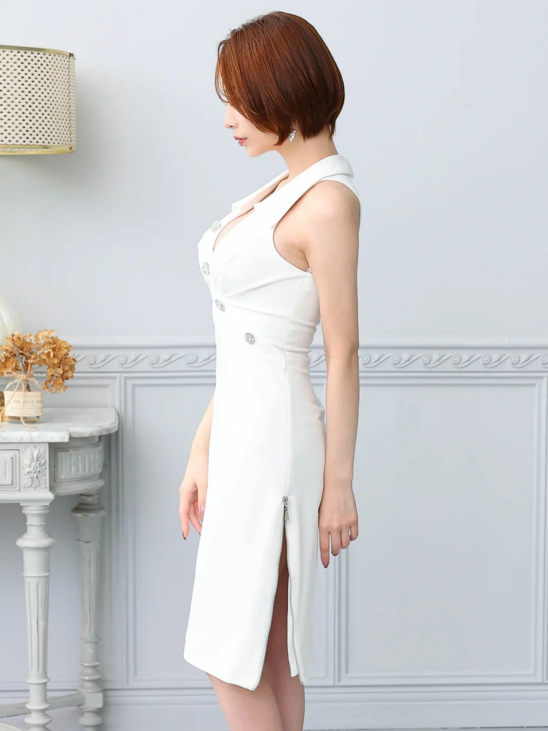 4. SALE【Veautt/ヴュート】アシンメトリー セクシー ジップデザイン タック ノースリーブ 襟付き ボタン 膝丈ドレス (VT032501)