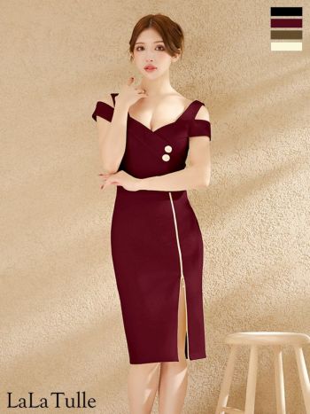 4. 【Veautt/ヴュート】ジップデザイン 肩あき ウエストマーク ボタン スリット セクシー 膝丈ドレス (VT082410)