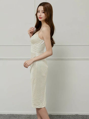 4. 【Veautt/ヴュート】スタッズ ノースリーブ チェーンストラップ Vカット アシンメトリーショルダー スリット 膝丈ドレス (VT082523)