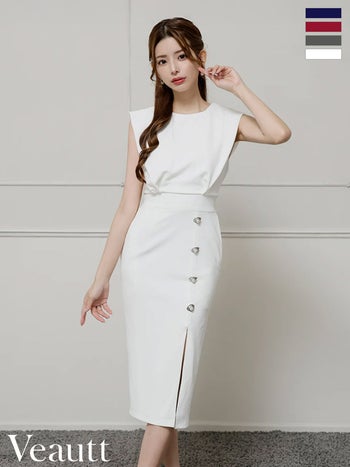 キャバドレス Veautt ヴュート ウエストマーク ボタン ワンカラー ノースリーブ シンプル スリット 膝丈ドレス