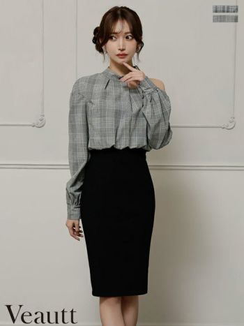 5. 予約商品【10月下旬入荷予定】【Veautt/ヴュート】チェック柄 肩あき チョーカー風 長袖 モノトーン タイト 膝丈ドレス(VT082529)