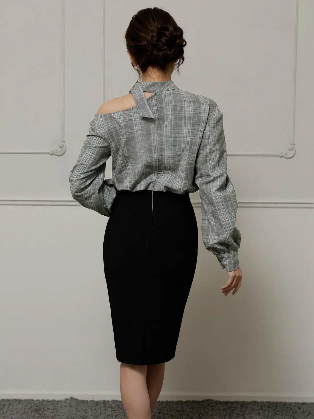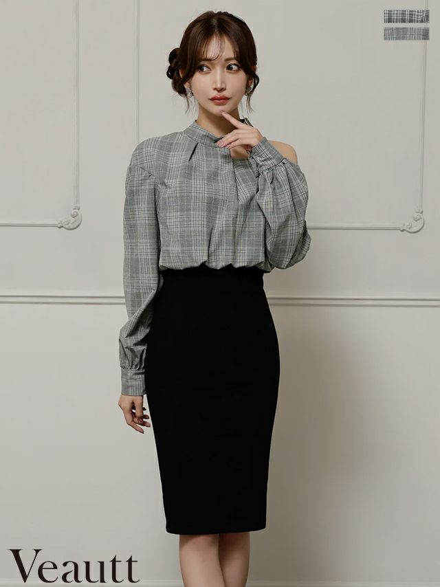 5. 【Veautt/ヴュート】チェック柄 長袖 モノトーン 肩あき チョーカー風 長袖 モノトーン タイト 膝丈ドレス(VT082529)