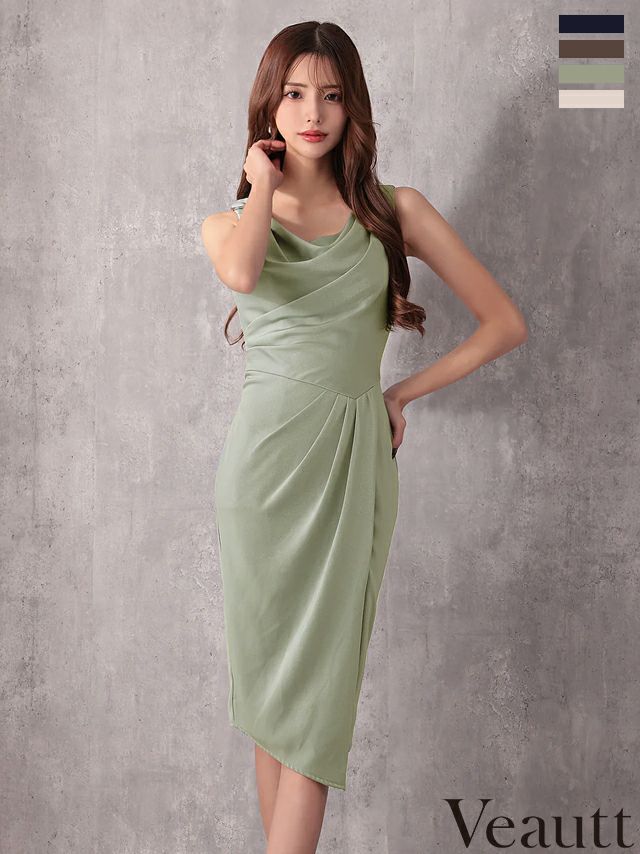 4. 【Veautt/ヴュート】ノースリーブ メタルパーツ ドレープ ラップデザイン スリット タック ワンカラー 膝丈ドレス (VT082530)