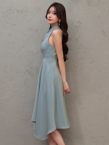 3. 【Veautt/ヴュート】ネックデザイン アシンメトリー ワンカラー ノースリーブ 膝丈ドレス (VT022605)