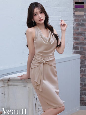 3. 予約商品【3月下旬入荷予定】【Veautt/ヴュート】ウエストツイスト バックオープン セクシー ドレープ ホルターネック ワンカラー タイト 膝丈ドレス (VT022606)