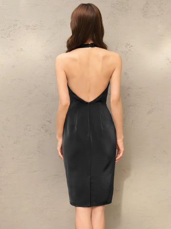 XSあり!大胆背中見せ♪ 予約商品【3月下旬入荷予定】【Veautt/ヴュート】ウエストツイスト バックオープン セクシー ドレープ ホルターネック ワンカラー タイト 膝丈ドレス (VT022606)
