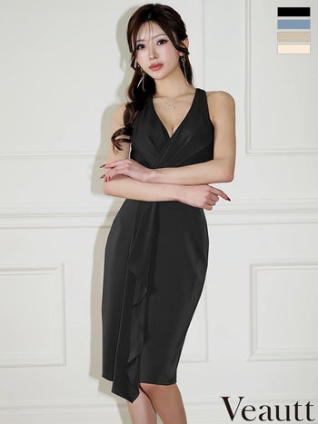 キャバドレス Veautt/ヴュート バストVカット タック ウエストマーク フリルデザイン タイト ノースリーブ 膝丈ドレス