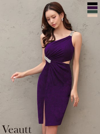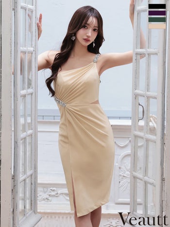 キャバドレス Veautt ヴュート ビジュー スリット タイト ワンショルダー ウエストカット タック 膝丈ドレス