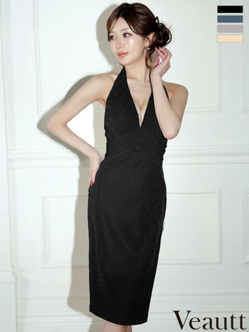 キャバドレス Veautt ヴュート Vカット ビジューチェーン タック バックオープンデザイン ジップデザイン ラメ タイト ホルターネック 膝丈ドレス