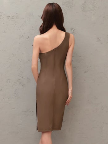 4. 予約商品【3月下旬入荷予定】【Veautt/ヴュート】ワンショルダー スリット ウエストタック アシンメトリー ジップデザイン バイカラー タイト 膝丈ドレス (VT082603)