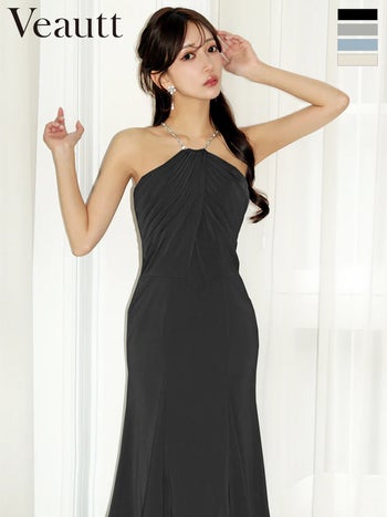 4. 予約商品【4月下旬入荷予定】【Veautt/ヴュート】ビジューチェーン ドレープ フレア ホルターネック 膝丈ドレス (VT082611)