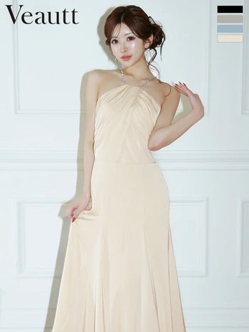XSあり!動くたびに優雅な印象を与える♪ 予約商品【4月下旬入荷予定】【Veautt/ヴュート】ビジューチェーン ドレープ フレア ホルターネック 膝丈ドレス (VT082611)