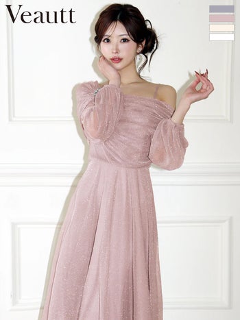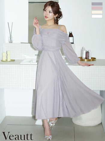 3. 予約商品【4月下旬入荷予定】【Veautt/ヴュート】アシンメトリーデザイン ドレープ ビジュー ラメ フレア 長袖 膝丈ドレス (VT082612)