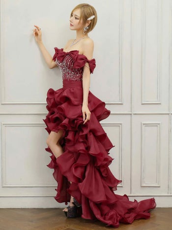 3. 【Angel R/エンジェルアール】ハートカット リボン ビジュー ウエストマーク フリル バースデー 2way オフショルダー 肩あき ロングテールドレス (AR25247)