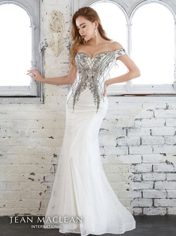 美しいビジュモチーフのオフショルダーのアイボリーのロングドレス。