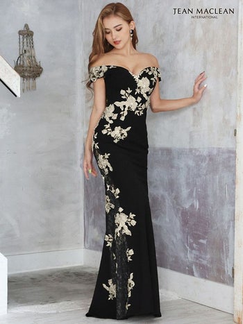 4. 【JEANMACLEAN/ジャンマクレーン】刺繍モチーフ ワンカラー オフショルダー タイトロングドレス[ブラック×シャンパン]
