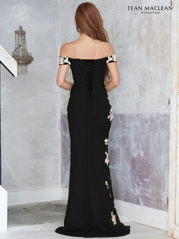 3. 【JEANMACLEAN/ジャンマクレーン】刺繍モチーフ ワンカラー オフショルダー タイトロングドレス[ブラック×シャンパン]