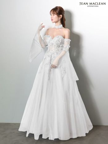 3. 予約商品【2月中旬入荷予定】【JEANMACLEAN/ジャンマクレーン】ベアトップ 袖付き 長袖 チョーカー フレアスリーブ バックスピンドル Aラインロングドレス (61037)