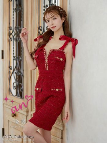 4. 【an/アン】ツイード フェイクポケット ゴールドチェーン ジップデザイン キャミソール リボン タイトミニドレス (AOC-3584)