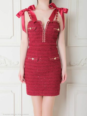 ツイード フェイクポケット ゴールドチェーン ジップデザイン キャミソール リボン タイトミニドレス