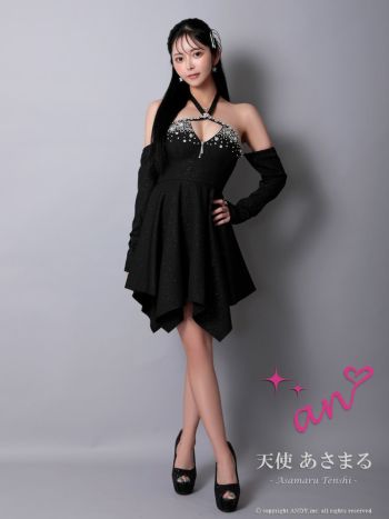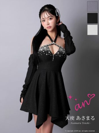 キャバドレス an ホルターネック 長袖 ジップデザイン ビジュー アシンメトリー フレアミニドレス