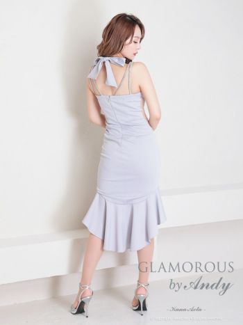 キャバドレス 膝丈ドレス GLAMOROUS グラマラス ビジュー バックリボン くびれ透け ホルターネック