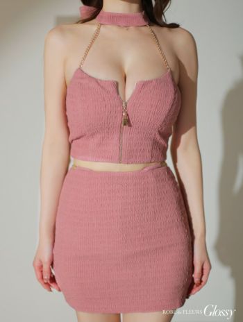 キャバドレス 高級 Glossy by ROBE de FLEURS グロッシー チェーン リボン ワンカラー ジップデザイン セットアップ セクシー オープンバスト ホルターネック タイトミニドレス