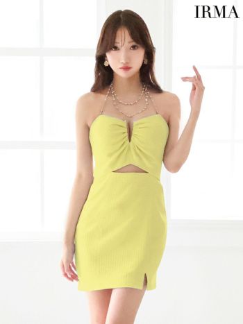 XSあり!セクシーなデザイン♪ 【IRMA/イルマ】セクシー オープンバスト チェーンビジュー ホルターネック ウエストカット 柄織りニット タイトミニドレス(55027)