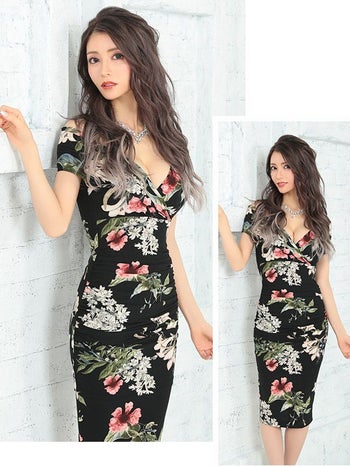 高品質な大人綺麗なキャバドレス♪ 61022 フラワープリント ストレッチ タイトミニドレス[2color]