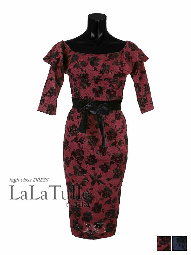 高品質な大人綺麗なキャバドレス♪ SALE【LaLaTulle】フリル×花柄 袖あり オフショルダー タイト 膝丈ドレス
