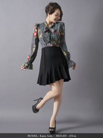 高品質な大人綺麗なキャバドレス♪ グレン チェック×花柄ブラウス風 フレアミニドレス[2color][Lあり][青田夏奈/キャバドレス着用]
