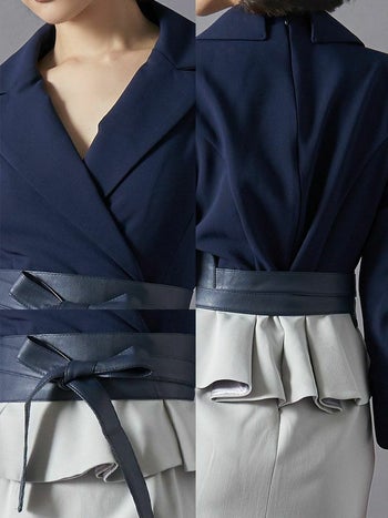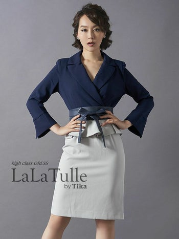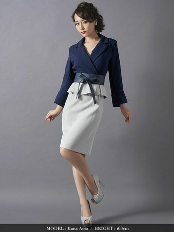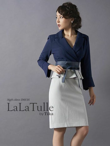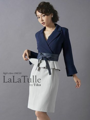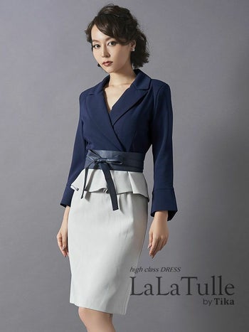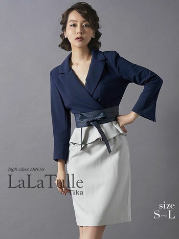 高品質な大人綺麗なキャバドレス♪ [韓国ドレス][LaLaTulle]ブラウス風 ペプラムリボン バイカラー 袖あり タイトひざ丈ドレス[ネイビー×グレー][Lあり][青田夏奈/キャバドレス着用]