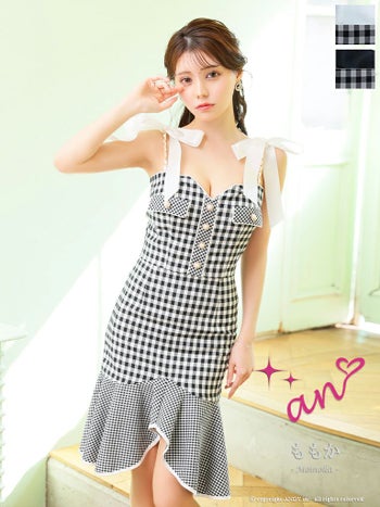 キャバドレス ミディアムドレス an アン ギンガム チェック柄 マーメイド セットアップ 裾フリル リボン キャミソール 膝丈ドレス