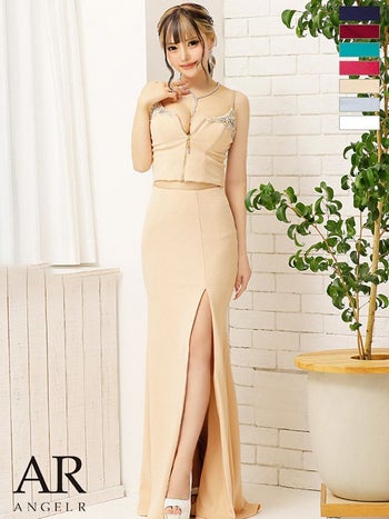 4. SALE【Angel R/エンジェルアール】キャミソール バストビジュー フロントジップセパレート セットアップ タイトロングドレス (AR23321)
