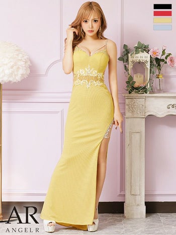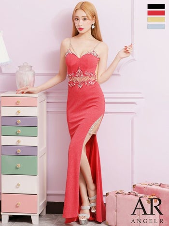 上品な輝きのラメ素材が美しい☆ 【Angel R/エンジェルアール】キャミソール ラメ 刺繍レース バストウエスト ビジュー スリット タイトロングドレス (AR24305)