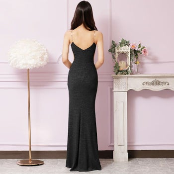 刺繍レース バストウエスト ビジュー ラメ キャミソール スリット タイトロングドレスのイメージ画像9