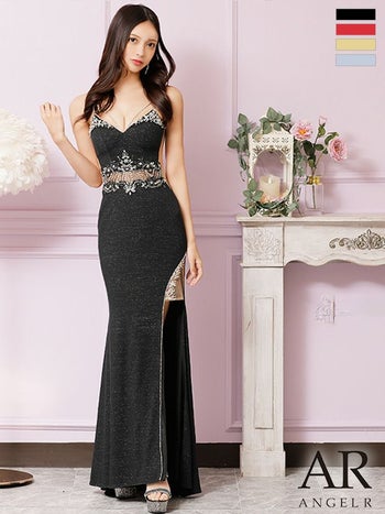 さりげなく透けるウエストがSEXY☆ 【Angel R/エンジェルアール】キャミソール ウエスト ビジュー ラメ 刺繍レース スリット タイトロングドレス (AR24305)