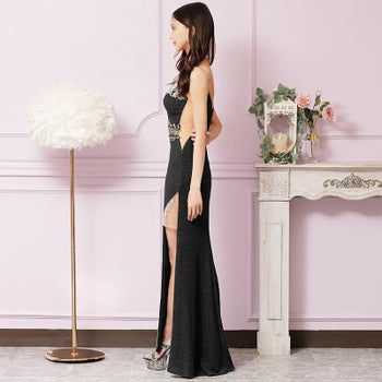 刺繍レース バストウエスト ビジュー ラメ キャミソール スリット タイトロングドレスのイメージ画像9