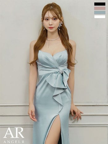キャバドレス Angel R エンジェルアール フェミニン キャミソール オープンバスト ウエストリボン タック ビジュー サテン スリット タイトロングドレス